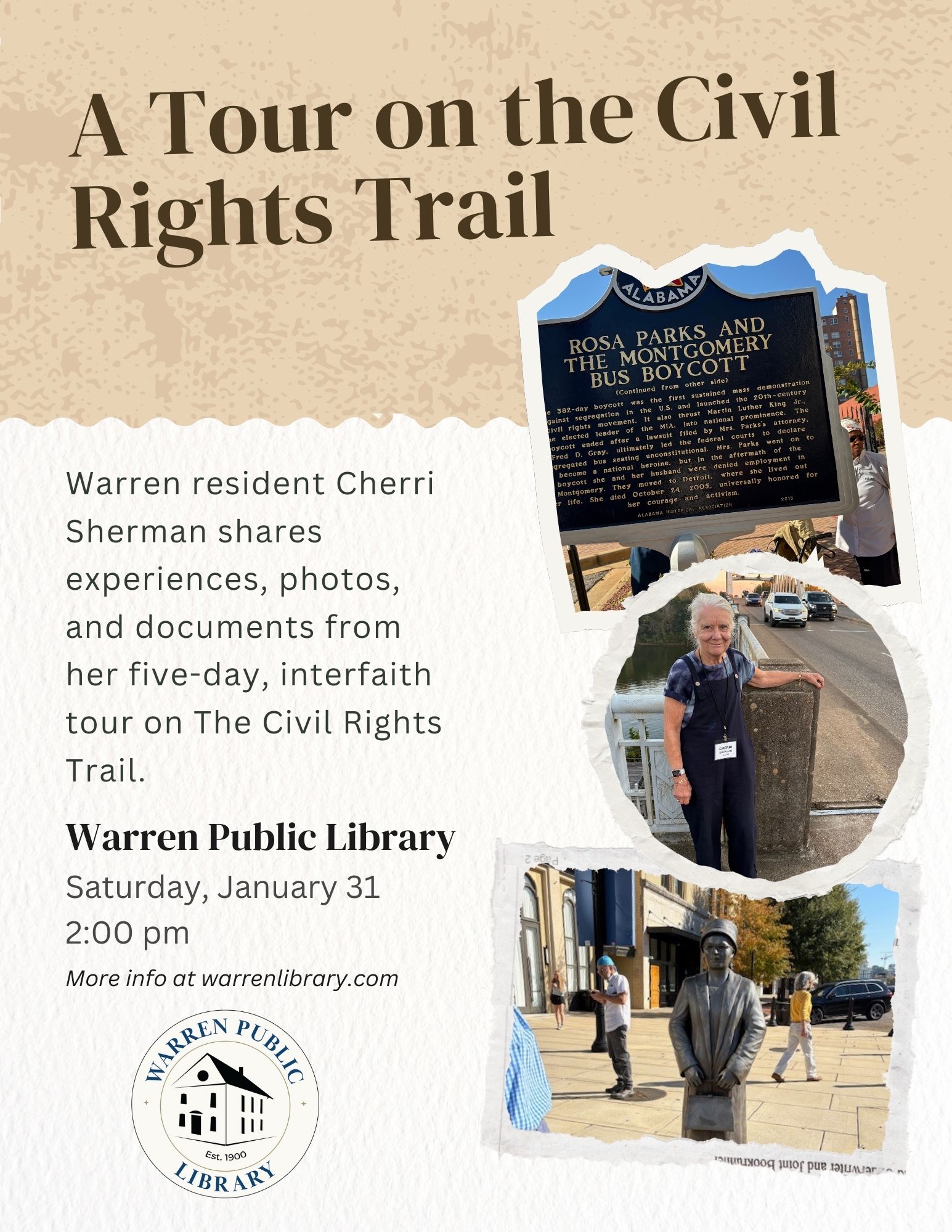 In this kickoff to Black History Month, Warren resident Cherri Sherman shares moving experiences, photos, and documents from her five-day, interfaith tour on The Civil Rights Trail including stops in Birmingham, Selma, Montgomery, and Atlanta.
