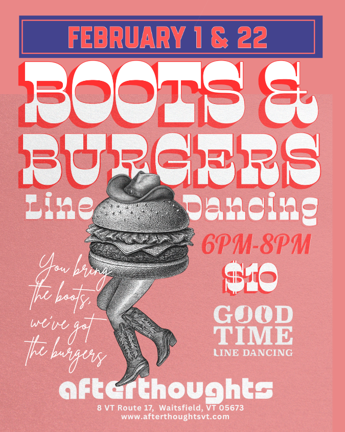 afterthoughts 8 Vt Route 17 200, Waitsfield, Vermont, United States👢You bring the Boots! 🍔 we've got the Burgers! 💃 Jenna will bring a Boot Scootin’ GOOD TIME to Afterthoughts!🤠 Warm up with us Sunday, February 1st for Line Dancing Lessons & Open Dance (Aprés Ski) from 6-8pm!🪩🕺
