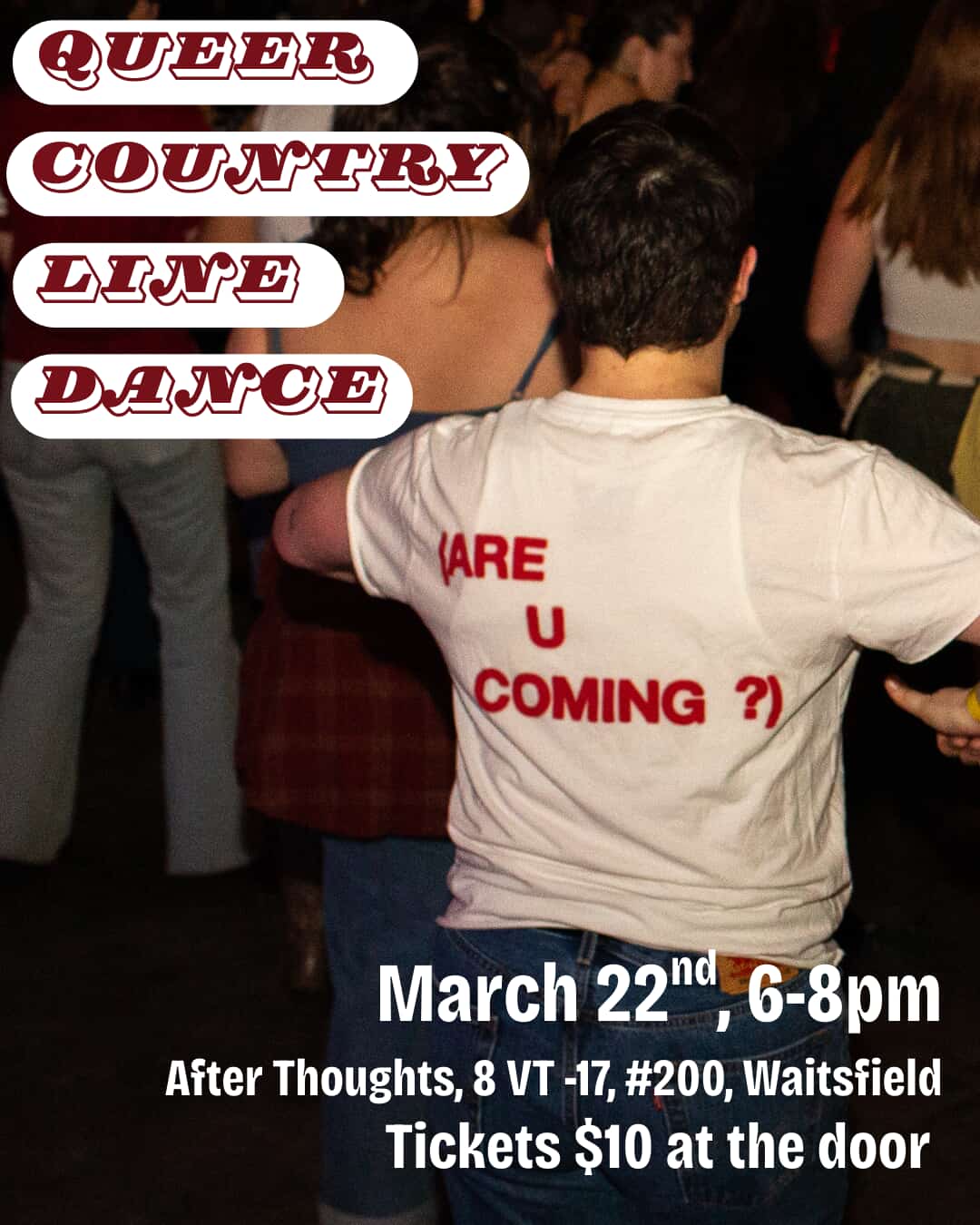 afterthoughts 8 Vt Route 17 200, Waitsfield, Vermont, United StatesOPEN TO ALL! Keep the party going Sunday night for some Line Dancing fun with the crew from Queer Country Line Dancing. $10 to dance. Dine in Peace Burger