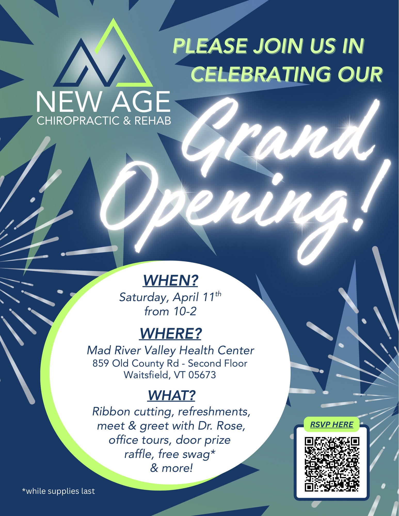 Mad River Valley Health Center 859 Old County Road Second Floor, Waitsfield, Vermont, United StatesCelebration of the opening of the valley’s newest option for pain relief! Refreshments, ribbon cutting, office tours, meet and greet with Dr. Rose, free swag (while supplies last) and a door prize all attendees are eligible to win!