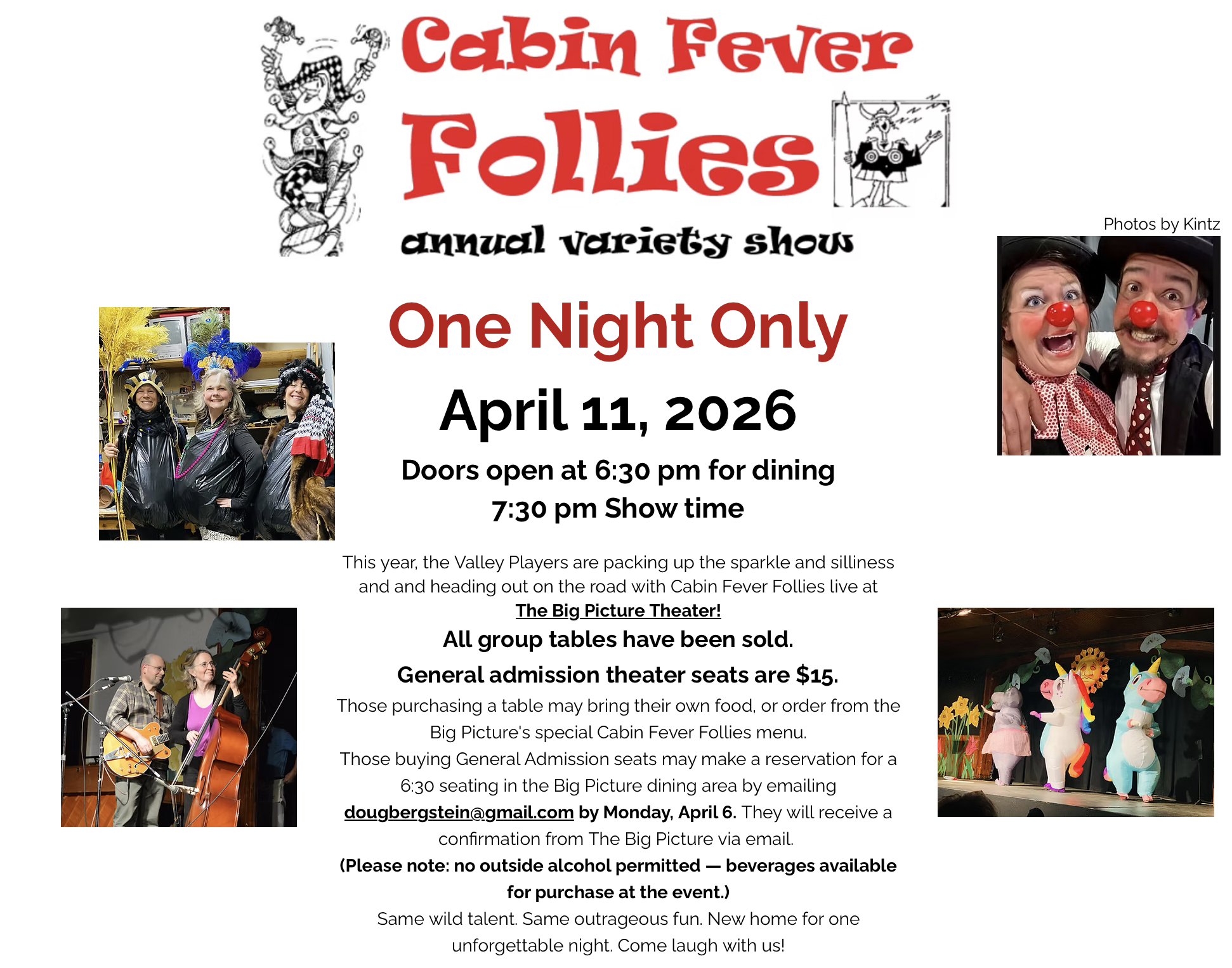 Big Picture Theater 44 Carroll Road, WaitsfieldTime & Location Apr 11, 2026, 7:00 PM Big Picture Theater & Cafe, 48 Carroll Rd, Waitsfield, VT 05673, USA About the event This year, the Valley Players are packing up the sparkle and silliness and heading out on the road with Cabin Fever Follies live at The Big Picture Theater! All group tables have…