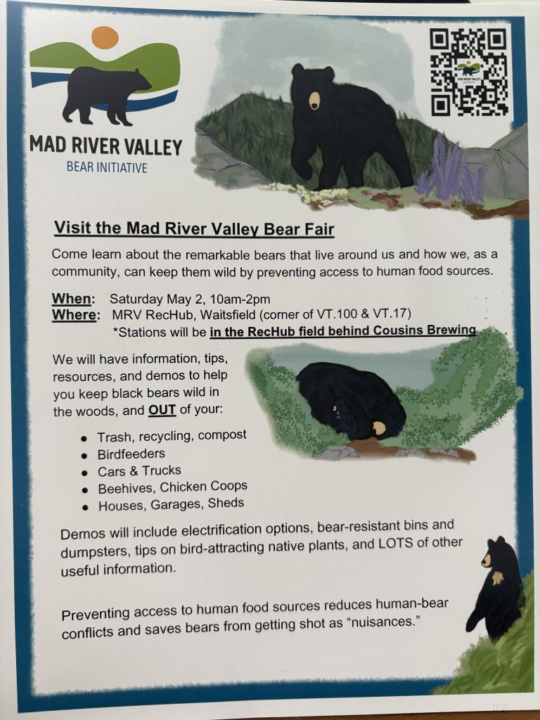 Chamber of Comerce 9 VT Rt 17, Waitsfield, Vermont, United StatesThe MRV Bear Initiative holds this event to share information about co-existing with the black bears in our landscape. We will have LOTS of information, resources, and demonstrations on black bears and how to keep them wild. The main goal is to deny them access to human food sources: trash, recycling, compost, birdfeeders, beehives, chicken…