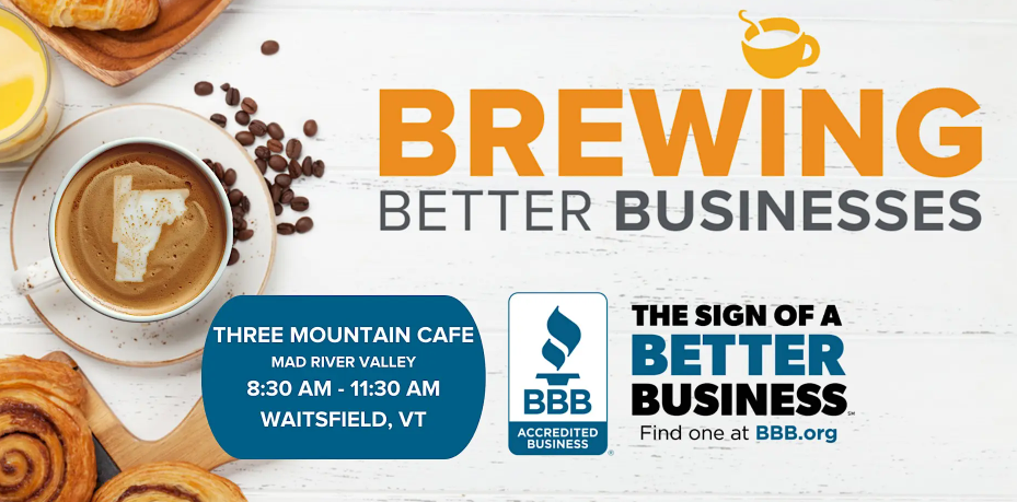 Three Mountain Cafe 107 Mad River green, WaitsfieldBrewing Better Business is a morning networking and educational event hosted at Three Mountain Cafe in the Mad River Valley. Join fellow local business owners and professionals for coffee, conversation,…
