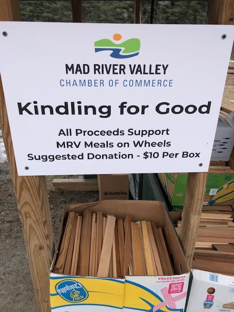 Everyone appreciates good quality kindling to get the home fires burning and now you can get some while supporting a great cause too. The MRV Chamber has initiated a new way to raise much needed funds for the Mad River Valley Senior’s Meals on Wheels program with the purchase of pre-made boxes of kindling. The kindling boxes can be picked up in the parking lot of Mad River Property Management/Vee’s Flowers (across from the Waitsfield Elementary School) anytime. They are stored in the roofed structures that are very obvious when you pull in. There is a suggested donation of $10 but feel free to give what you can. If you prefer you can donate online and pick up the boxes of kindling at your convenience.